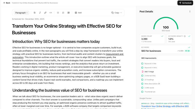 Genseo creates, optimizes, and schedules your content automatically. From keyword discovery to daily article creation and a fully managed content calendar, so your traffic grows consistently.