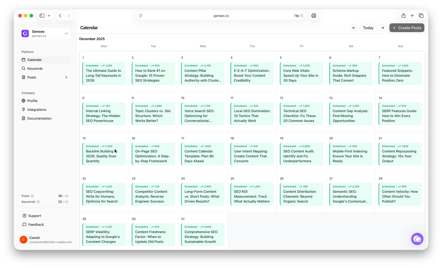 Genseo creates, optimizes, and schedules your content automatically. From keyword discovery to daily article creation and a fully managed content calendar, so your traffic grows consistently.